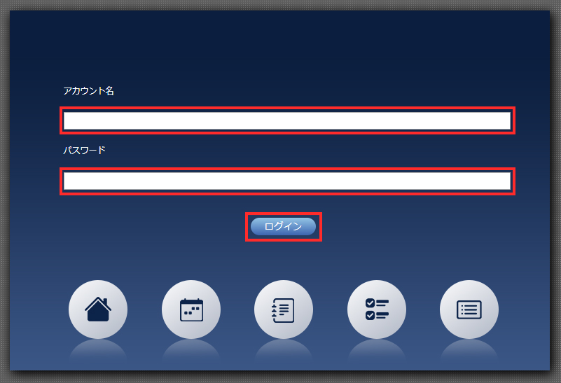 「アカウント名」と「パスワード」を入力し、「ログイン」ボタンを押してログインします。