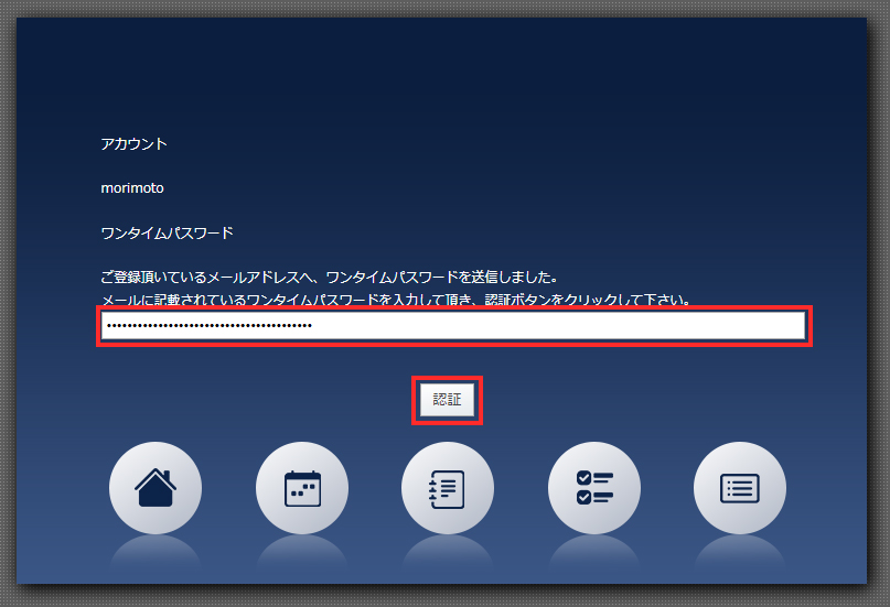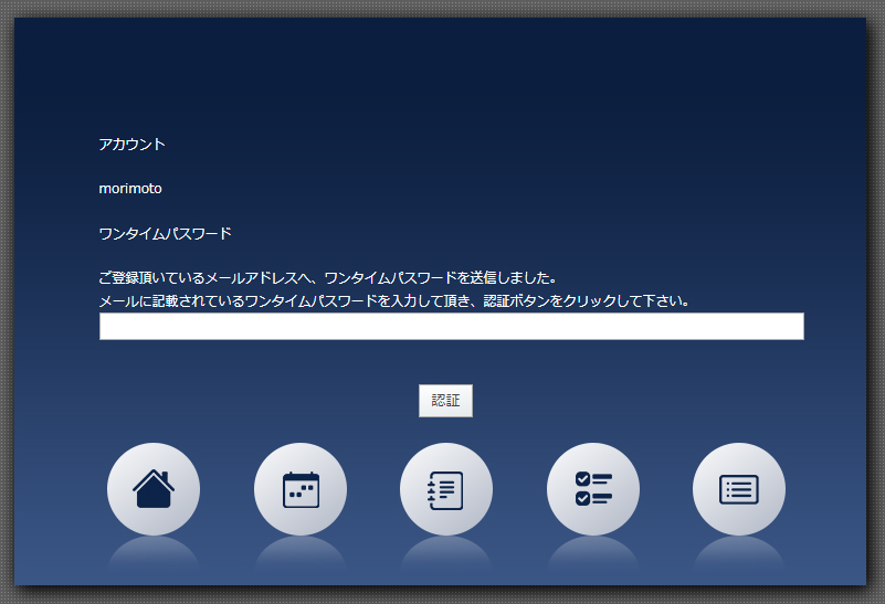 「アカウント名」と「パスワード」を入力すると、設定されたメールアドレスへ認証用パスワードが送信されます。認証画面にて認証用パスワードを入力して頂く事でログインできる仕組みになっています。