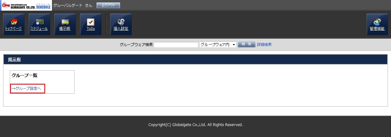 掲示板画面のグループ一覧で、「グループ設定へ」を押します。