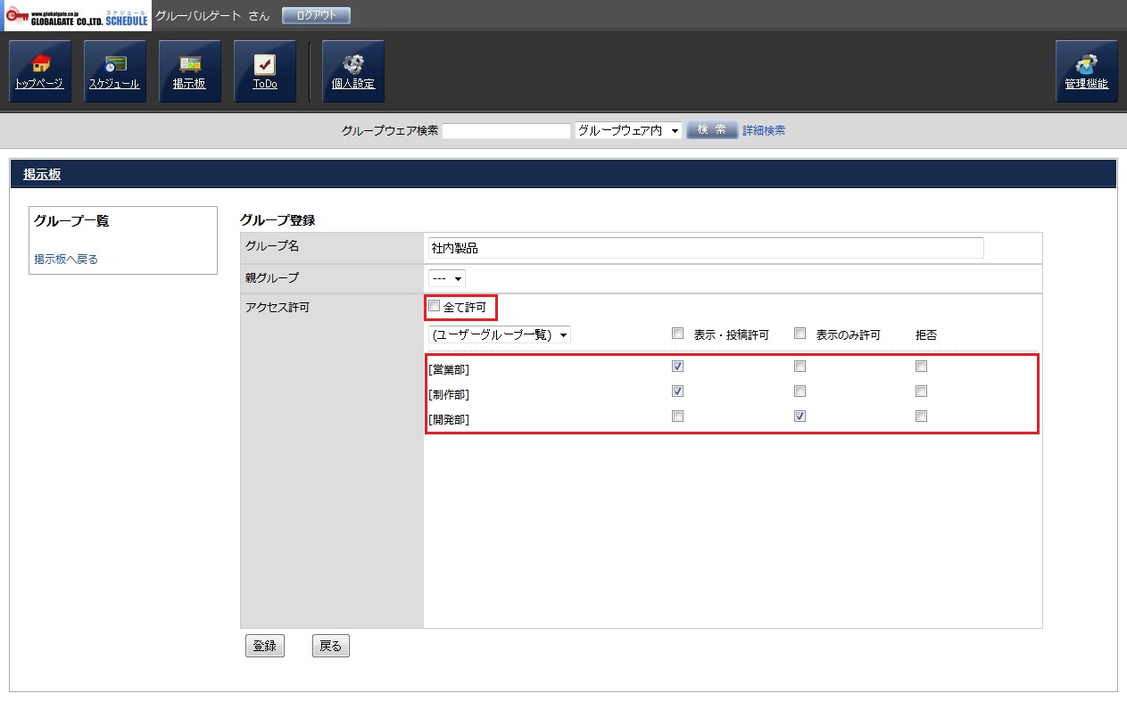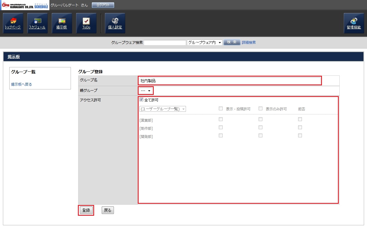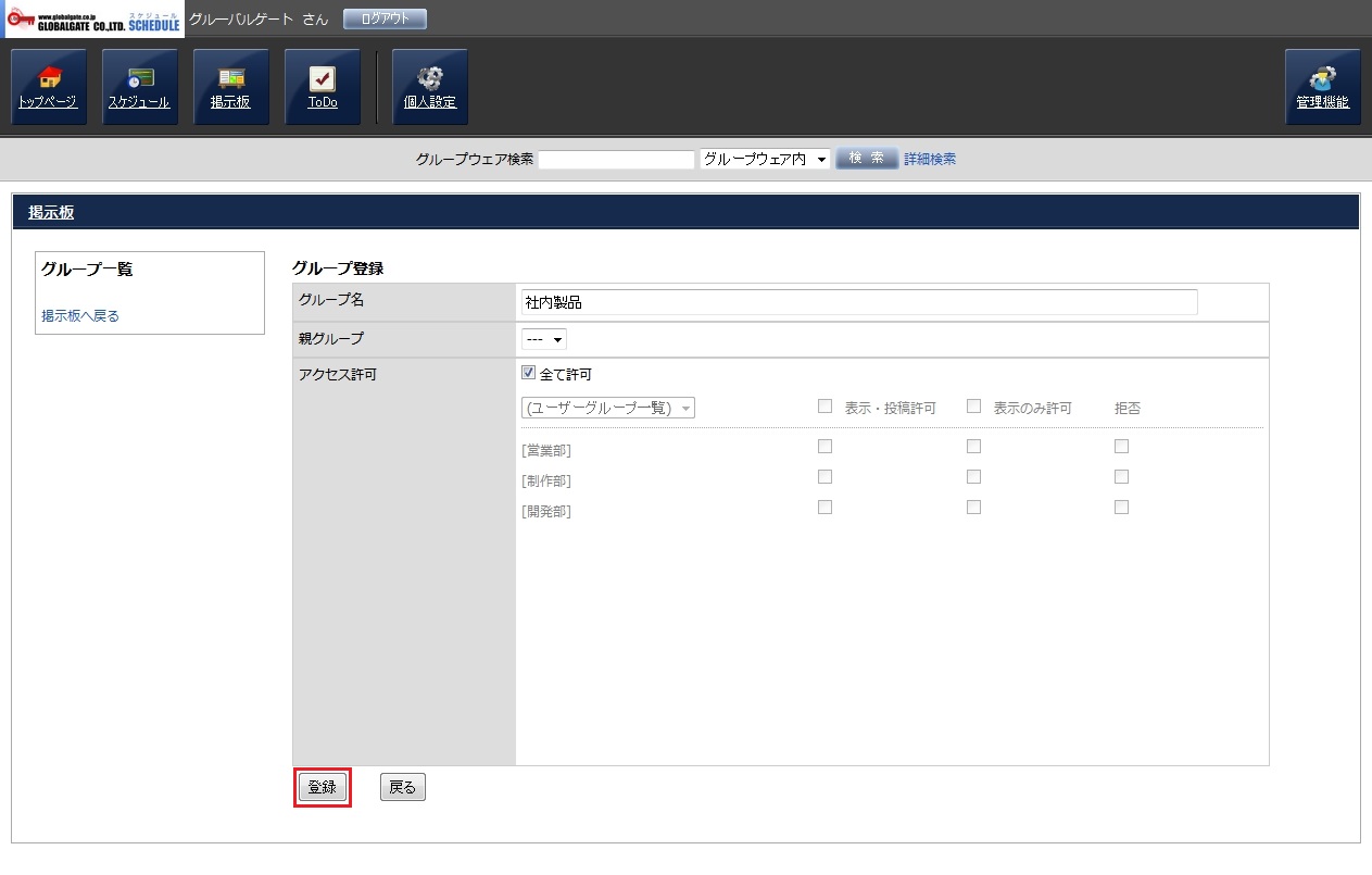 グループ登録画面が表示されますので、各項目を入力し、「登録」ボタンを押してグループを登録します。