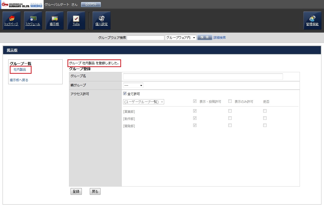 画面上部に、登録が完了したメッセージが表示され、グループ一覧に登録したグループが追加されます。