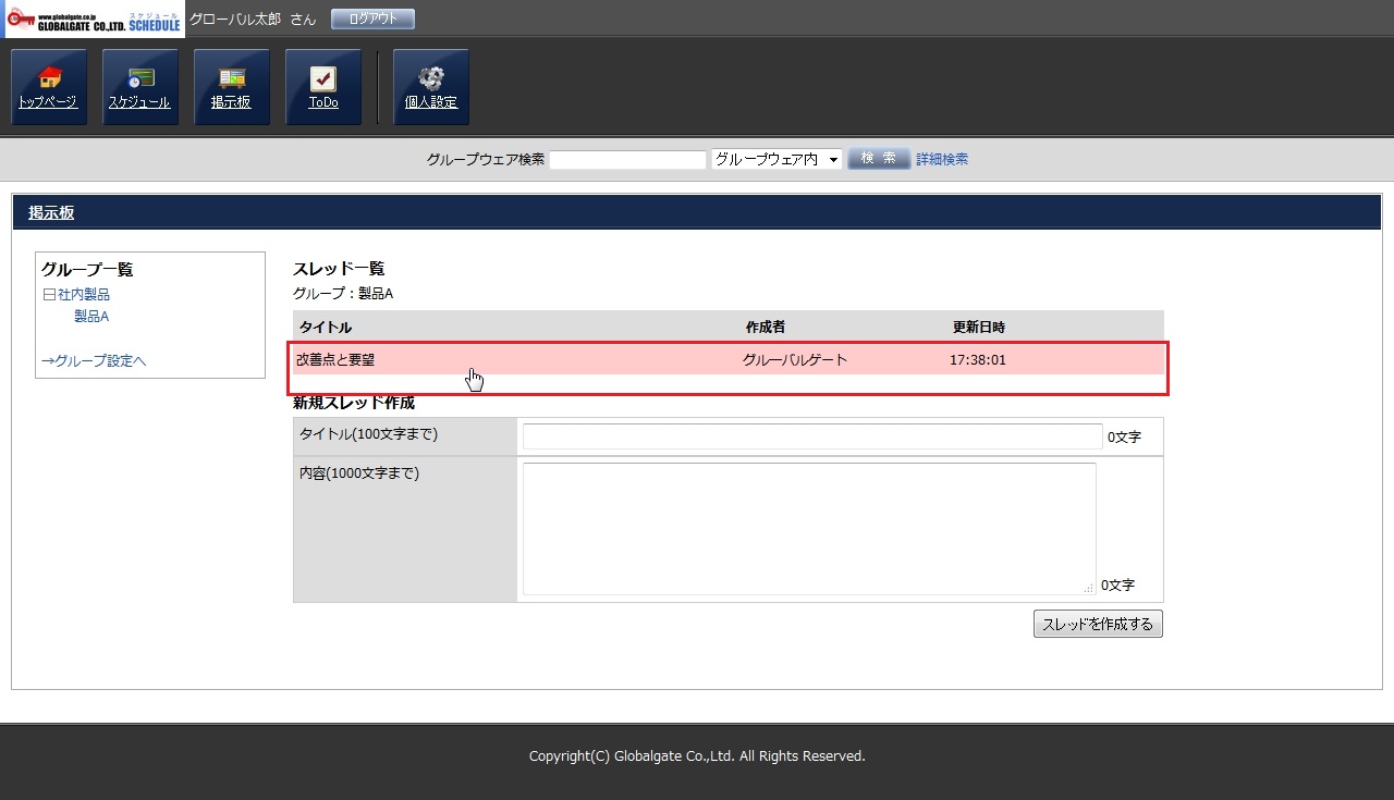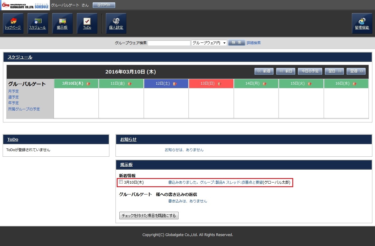 スレッドが作成される時と同様に、「投稿」された際もTOP画面の掲示板欄に通知が表示されます。
