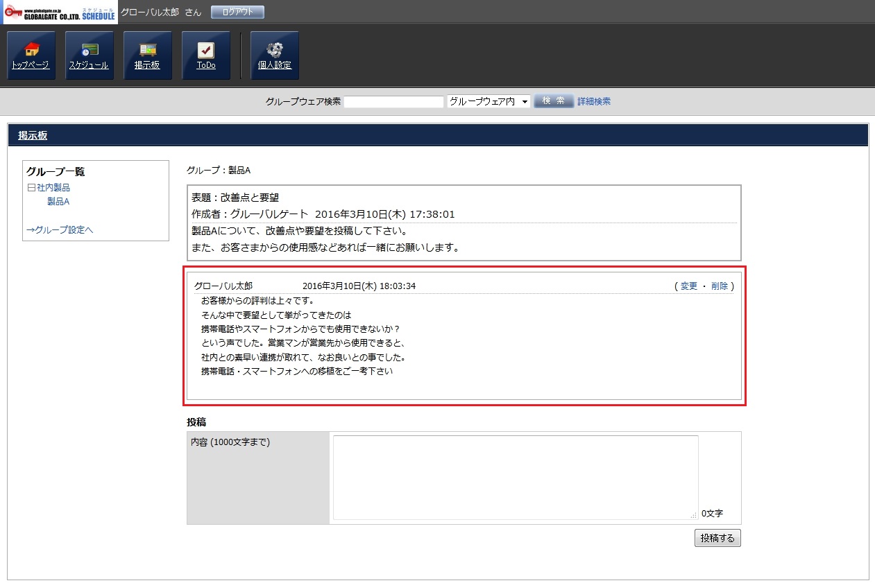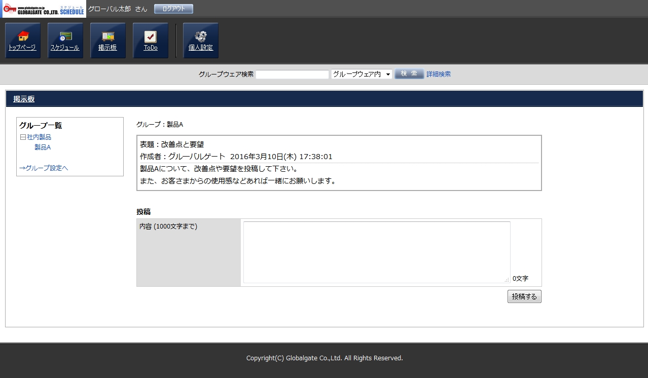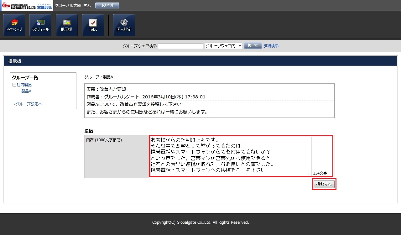 投稿欄に内容を入力し、「投稿する」ボタンを押して投稿します。