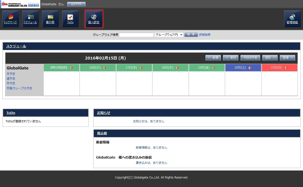 画面上部にある「個人設定」ボタンを押すと、個人設定画面が表示されます。