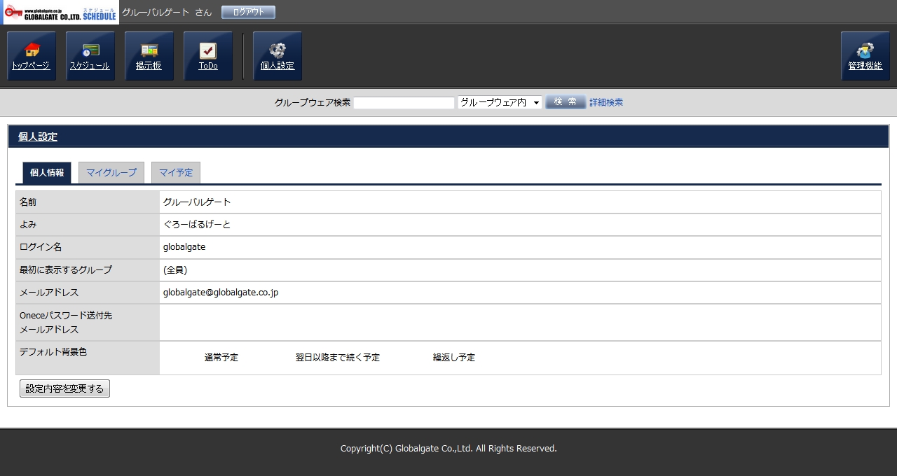 ログインする際のパスワードの変更や、自分だけが使用するグループ(マイグループ)の設定など、「自分だけ」の設定を行う事ができます。