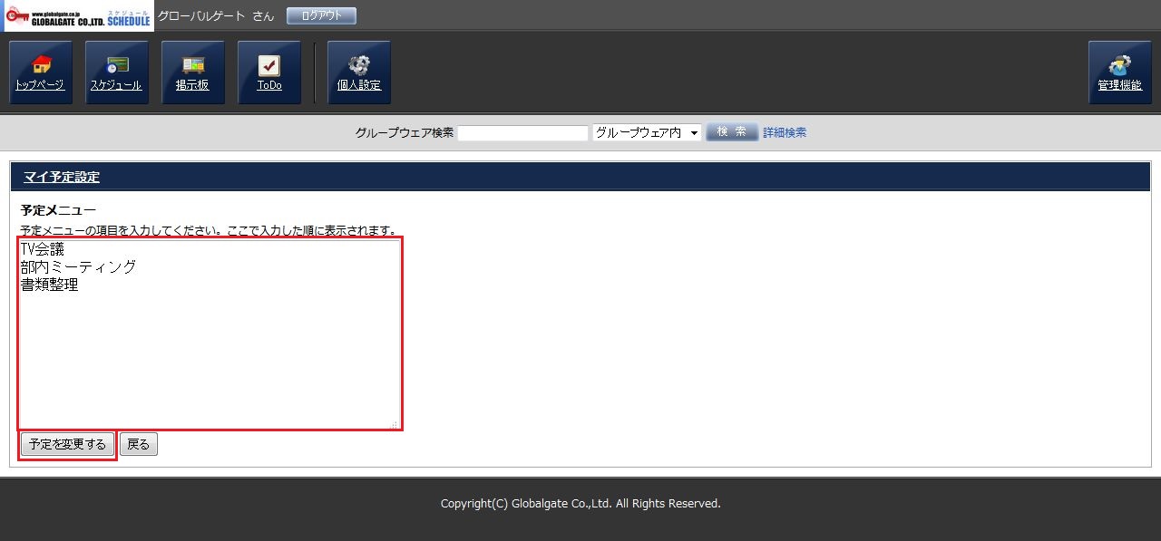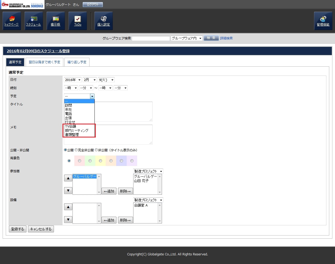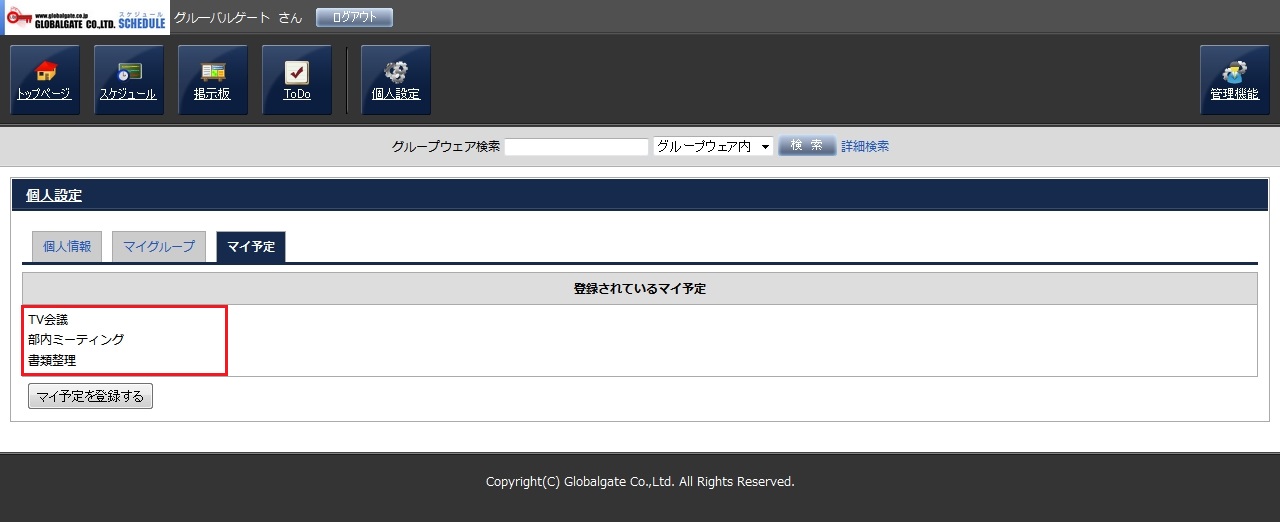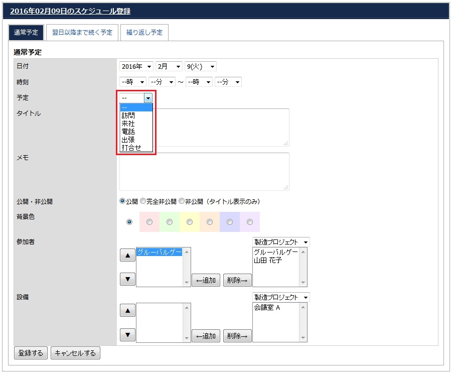 スケジュールを登録する際、頻繁に使用する「予定」がプルダウンメニューに無い場合、この機能を使用して追加する事ができます。「マイ予定」は登録したユーザーだけが利用できます。