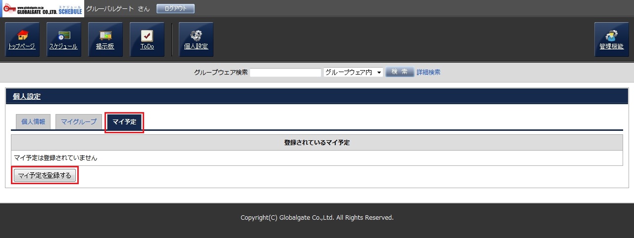 「マイ予定」を追加するには、個人設定画面の「マイ予定」を押し、「マイ予定を登録する」ボタンを押します。
