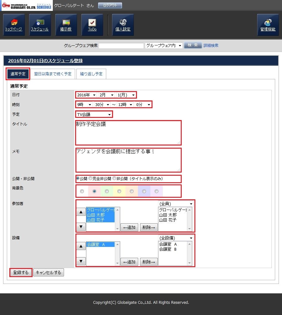 1日だけの予定を登録する場合、この画面にて入力を行います。