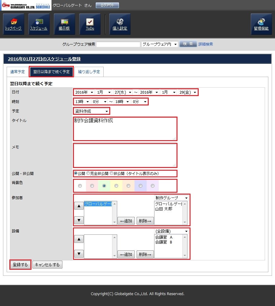 入力する日付が2箇所になっただけで、他は通常予定と変わりありません。