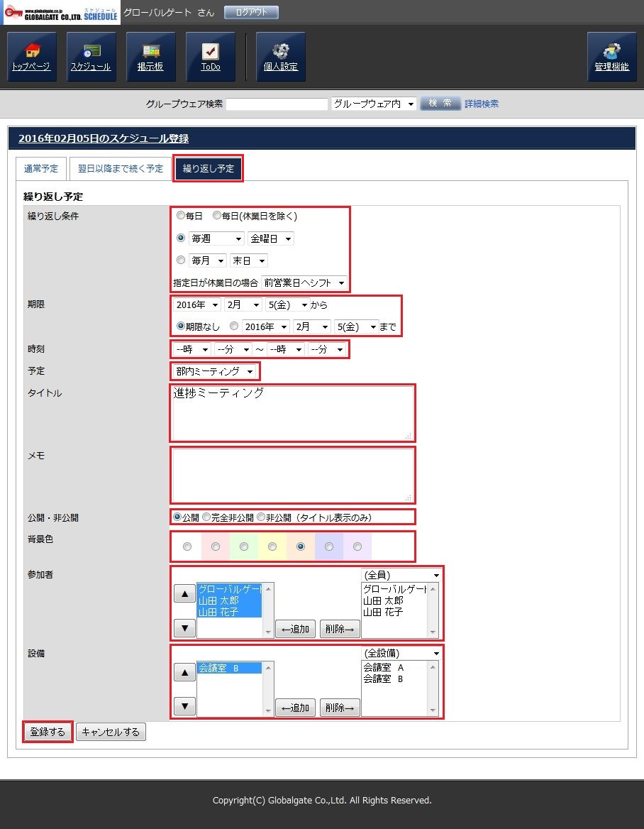 毎週○曜日や毎月△日という繰り返し行う予定の場合、この画面にて入力を行います。