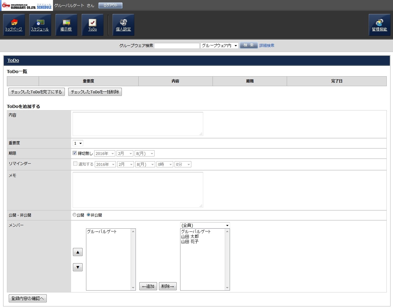 ToDo機能は、画面上部の「ToDo」ボタンを押して利用します。