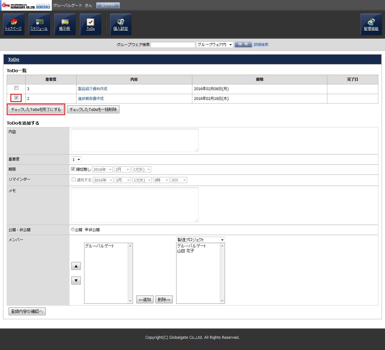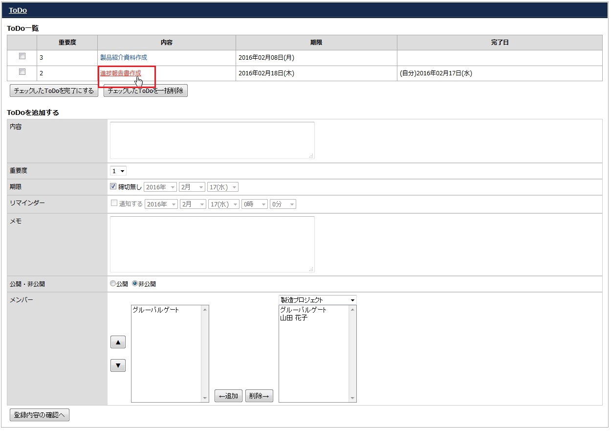 ToDoを完了するには、ToDo一覧にて、ToDoのチェックボックスにチェックを入れ「チェックをしたToDoを完了にする」ボタンを押します。