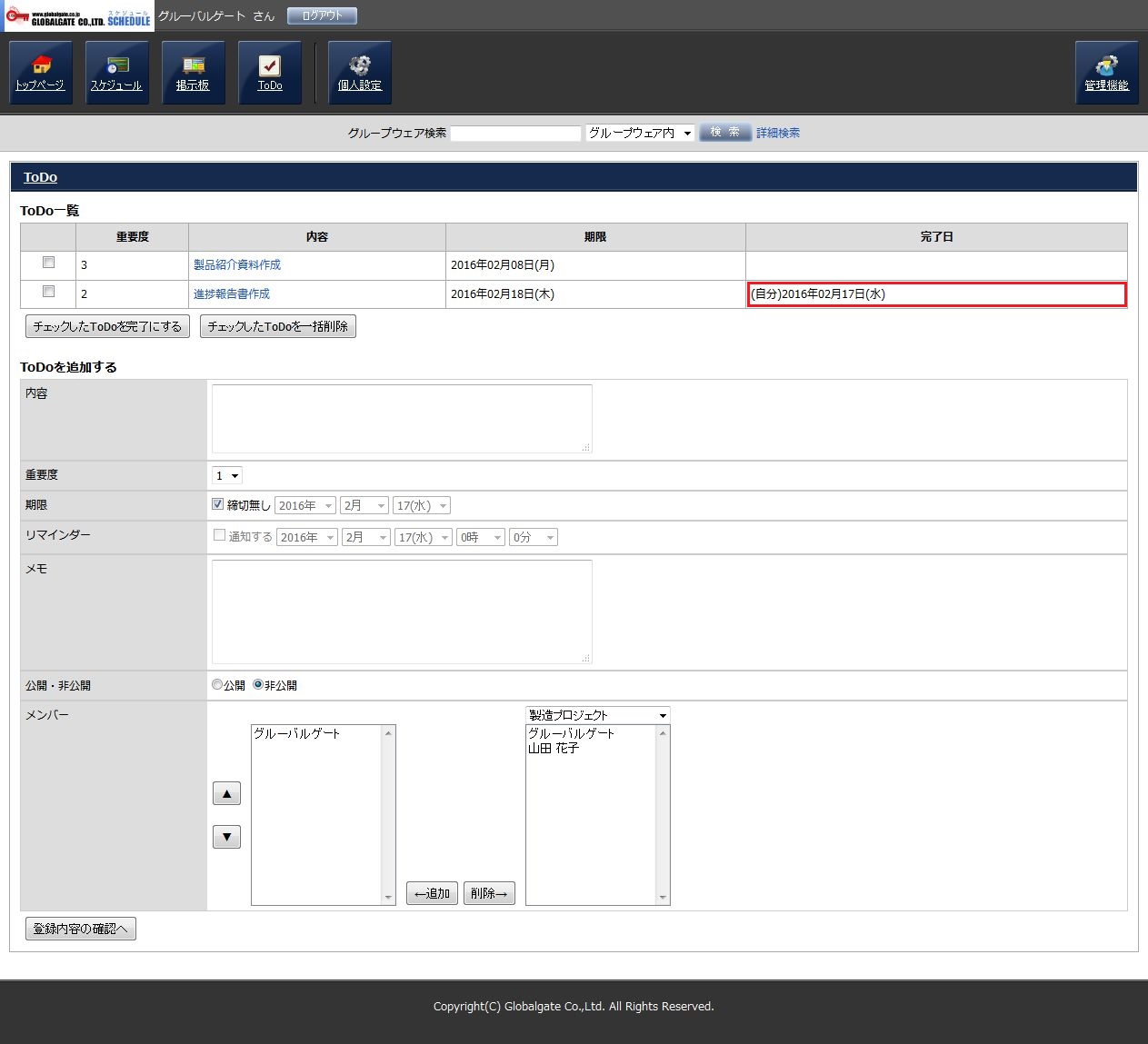 TOP画面やスケジュール欄にはToDoが表示されなくなりますが、ToDo一覧には残っており、完了日も表示されていますので、完了した日を後で確認する事が可能です。