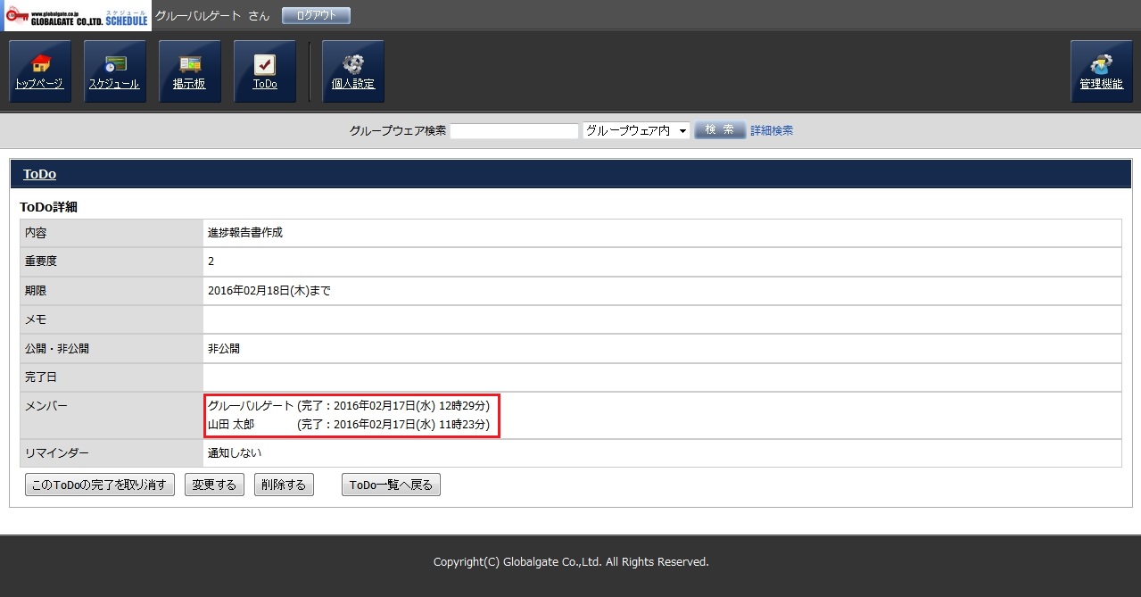 また、複数メンバーでのToDoの場合、各メンバーが完了したかどうかの確認はToDo詳細画面にて行えます。