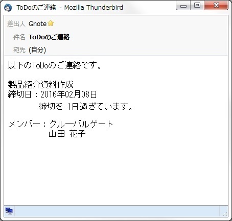 また、「完了」していないToDoで期限を超過した場合、リマインダーにて「通知する」に設定されていれば、「完了」にするまで毎日通知メールが送信されます。